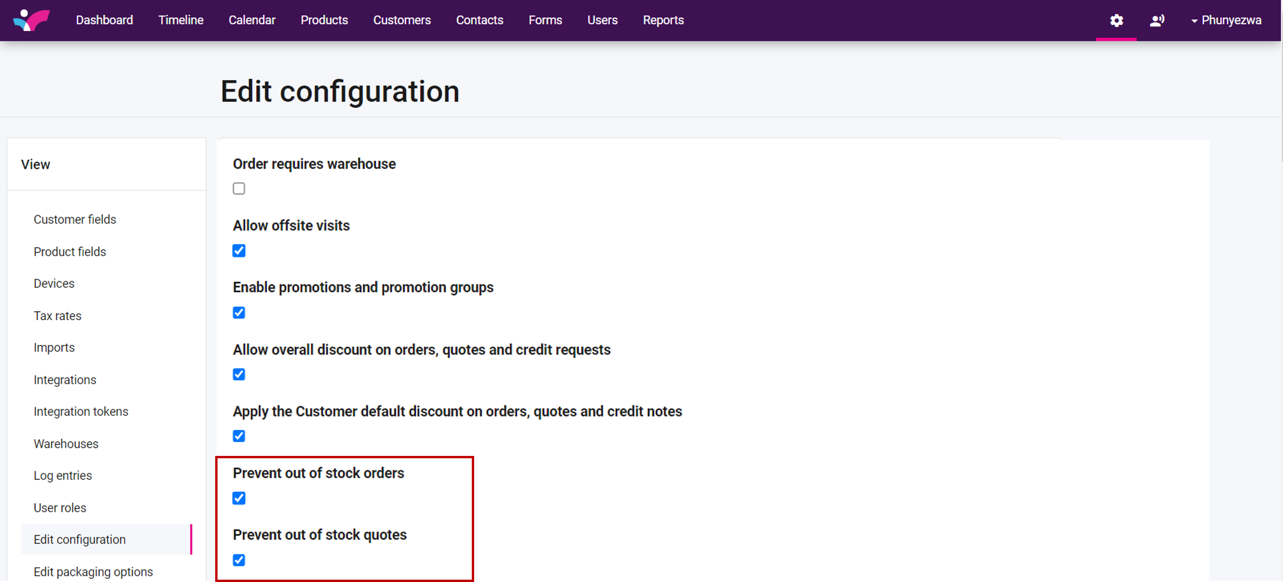 If these options are checked and highlighted with a tick this means that the field user will not be able to process orders or quotes for items that are out of stock. To deactivate this simply deselect these options and the field users will be able to process orders and quotes for the out of stock items.