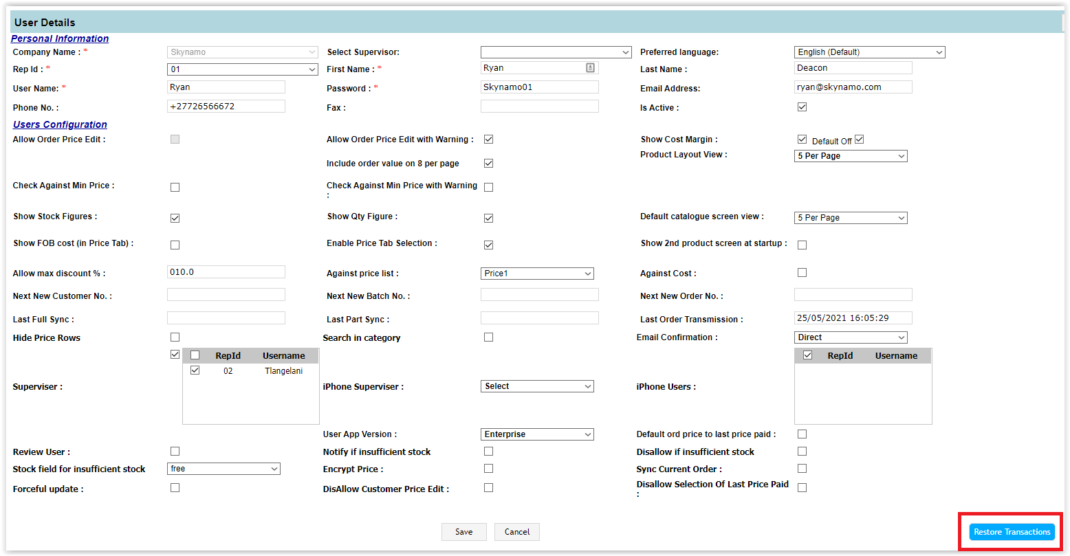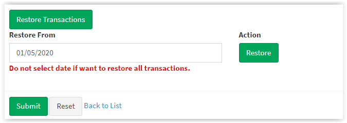 On the user page, you need to scroll down a bit to find a green button which says Restore Transactions