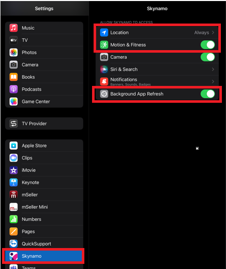 -Settings > Skynamo > Motion and Fitness ON