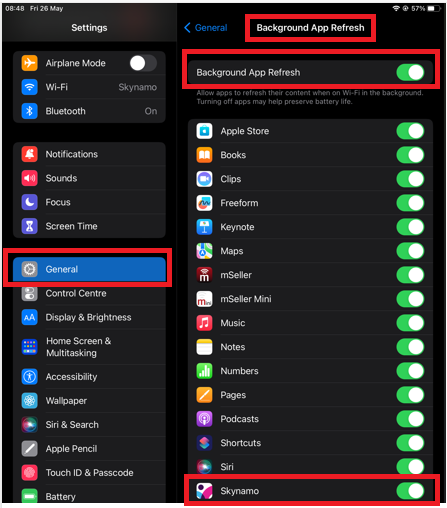 Settings > General > Background app refresh > Ensure that it is on and that it is switched on for Skynamo: