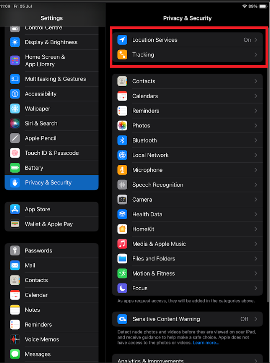 In the left-hand view, go to Privacy and Security and make sure your Location Services has been switched on and that your Tracking has been enabled: